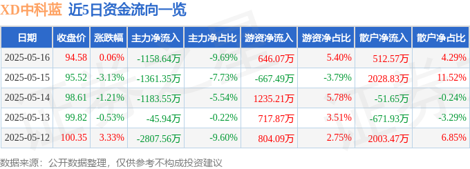 5月16日的资金流向数据方面,主力资金净流出1158.64万元,占总成交额9.69%,游资资金净流入646.07万元,占总成交额5.4%,散户资金净流入512.57万元,占总成交额4.29%。