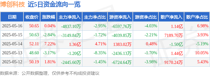 5月16日的资金流向数据方面,主力资金净流出4837.1万元,占总成交额2.95%,游资资金净流出6597.76万元,占总成交额4.03%,散户资金净流入1.14亿元,占总成交额6.98%。