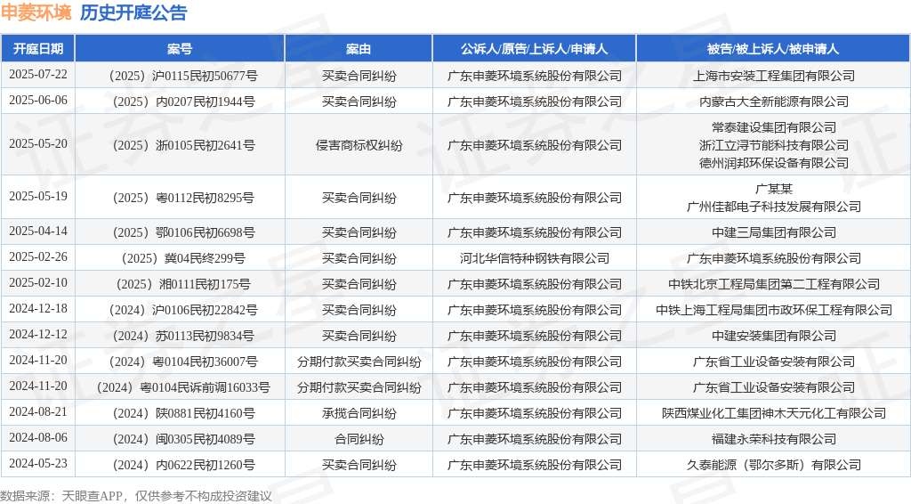 案号:(2025)粤0112民初8295号根据统计,近一年内以广东申菱环境系统股份有限公司为当事人的历史开庭公告有14则,其中案由为“买卖合同纠纷”的公告以9则居首,其次为“分期付款买卖合同纠纷”有2则,“侵害商标权纠纷”有1则。历史开庭公告如下: