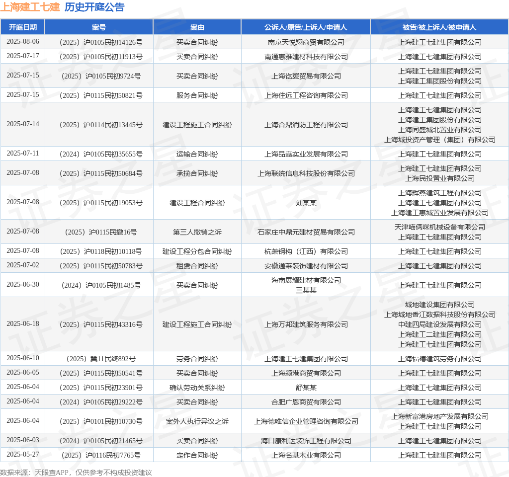 案号:(2025)沪0112民初21701号根据统计,近一年内以上海建工七建集团有限公司为当事人的历史开庭公告有222则,其中案由为“建设工程施工合同纠纷”的公告以53则居首,其次为“买卖合同纠纷”有44则,“建设工程分包合同纠纷”有31则。历史开庭公告(前20条)如下:
