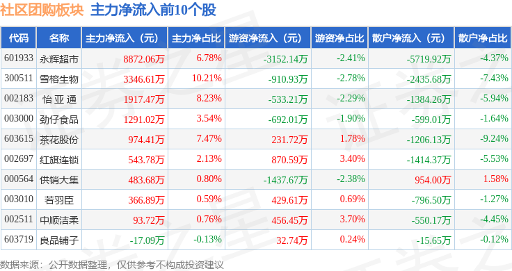 从资金流向上来看,当日社区团购板块主力资金净流出1.02亿元,游资资金净流出1490.66万元,散户资金净流入1.17亿元。社区团购板块个股资金流向见下表: