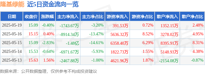 证券之星消息,截至2025年5月19日收盘,隆基绿能(601012)报收于15.09元,下跌0.4%,换手率0.48%,成交量36.28万手,成交额5.45亿元。