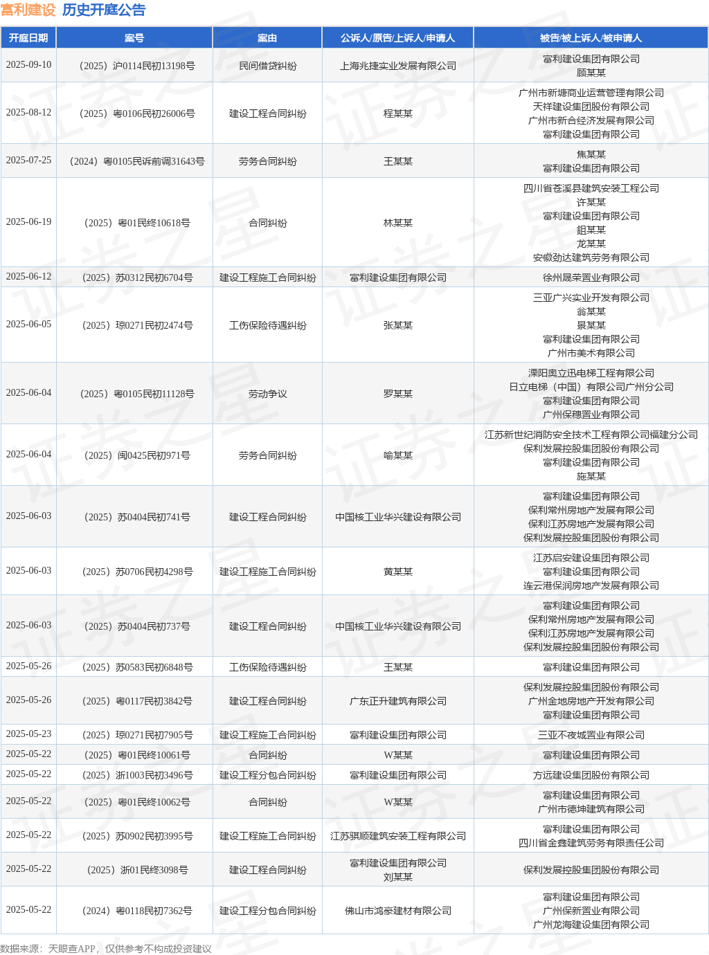 案号:(2025)浙01民终3098号根据统计,近一年内以富利建设集团有限公司为当事人的历史开庭公告有256则,其中案由为“劳务合同纠纷”的公告以43则居首,其次为“建设工程分包合同纠纷”有38则,“建设工程施工合同纠纷”有35则。历史开庭公告(前20条)如下: