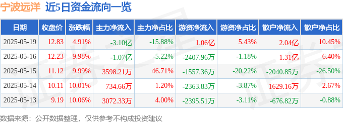 5月19日的资金流向数据方面,主力资金净流出3.1亿元,占总成交额15.88%,游资资金净流入1.06亿元,占总成交额5.43%,散户资金净流入2.04亿元,占总成交额10.45%。