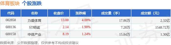 证券之星消息,5月20日体育板块较上一交易日上涨1.81%,力盛体育领涨。当日上证指数报收于3380.48,上涨0.38%。深证成指报收于10249.17,上涨0.77%。体育板块个股涨跌见下表: