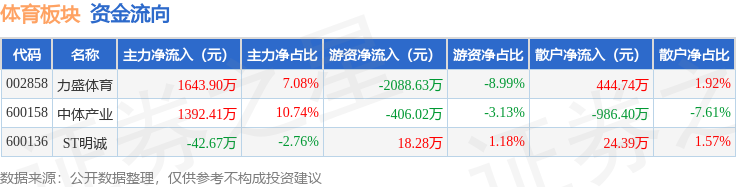 从资金流向上来看,当日体育板块主力资金净流入2993.64万元,游资资金净流出2476.37万元,散户资金净流出517.27万元。体育板块个股资金流向见下表: