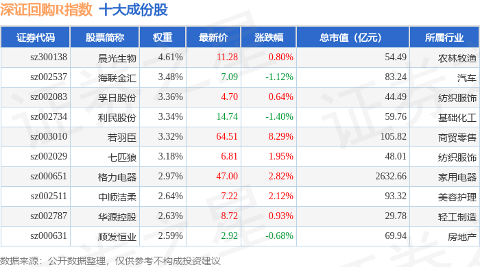 证券之星消息,5月20日,深证回购R(470063)指数报收于2479.69点,涨0.82%,成交162.98亿元,换手率1.51%。当日该指数成份股中,上涨的有40家,若羽臣以8.29%的涨幅领涨,下跌的有10家,集泰股份以8.9%的跌幅领跌。