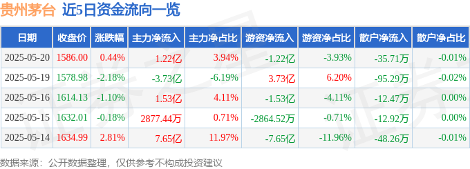 证券之星消息,截至2025年5月20日收盘,贵州茅台(600519)报收于1586.0元,上涨0.44%,换手率0.16%,成交量1.95万手,成交额30.96亿元。