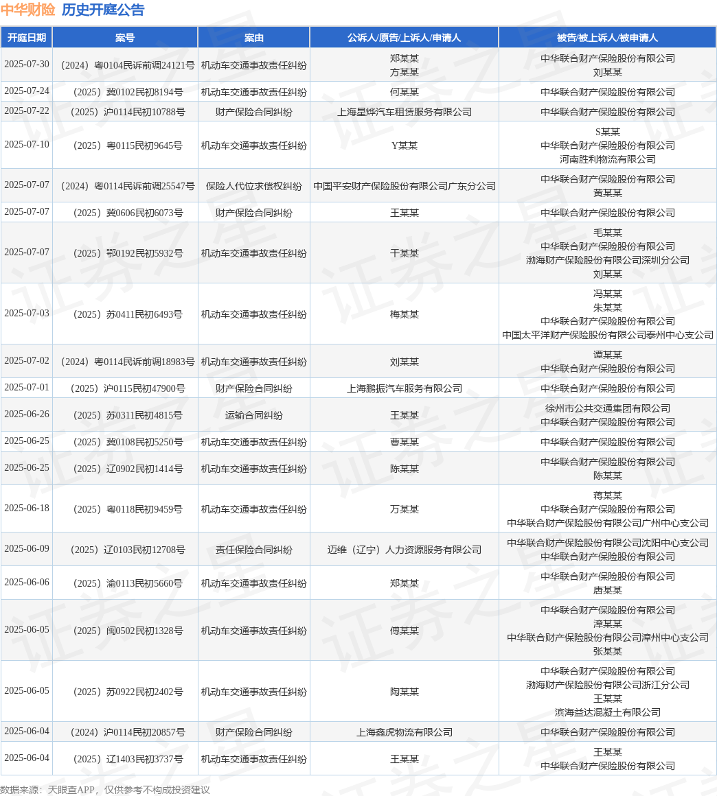 案号:(2025)冀0722民初1274号根据统计,近一年内以中华联合财产保险股份有限公司为当事人的历史开庭公告有883则,其中案由为“机动车交通事故责任纠纷”的公告以488则居首,其次为“财产保险合同纠纷”有82则,“人身保险合同纠纷”有62则。历史开庭公告(前20条)如下: