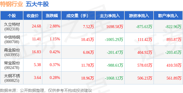 个股表现方面,特钢行业当日领涨股为久立特材(002318),该股当日报收24.68,上涨2.88%,成交量7.52万,主力资金净流入1698.58万元。中信特钢(000708)以上涨1.15%紧随其后,该股当日成交量10.45万,主力资金净流出1005.29万元。除此之外,甬金股份(603995)、常宝股份(002478)、太钢不锈(000825)均进入当日牛股之列。具体个股列表见下表: