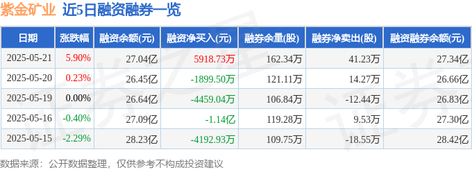 紫金矿业融资融券信息显示,融资方面,当日融资买入3.91亿元,融资偿还3.32亿元,融资净买入5918.73万元,净买入额两市排名第9。融券方面,融券卖出56.08万股,融券偿还14.85万股,融券余量162.34万股,融券余额3001.59万元。融资融券余额27.34亿元。