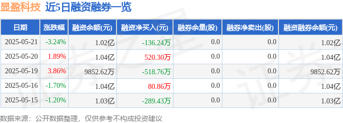 显盈科技融资融券信息显示,融资方面,当日融资买入588.08万元,融资偿还724.32万元,融资净偿还136.24万元。融券方面,融券卖出0.0股,融券偿还0.0股,融券余量0.0股,融券余额0.0万元。融资融券余额1.02亿元。