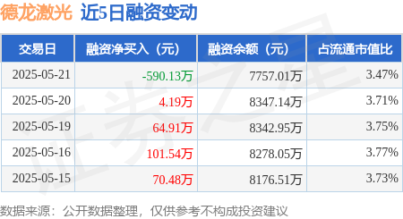 证券之星消息,5月21日,德龙激光(688170)融资买入149.04万元,融资偿还739.17万元,融资净卖出590.13万元,融资余额7757.01万元。