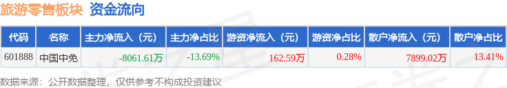 从资金流向上来看,当日旅游零售板块主力资金净流出8061.61万元,游资资金净流入162.59万元,散户资金净流入7899.02万元。旅游零售板块个股资金流向见下表:
