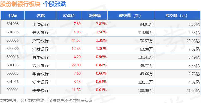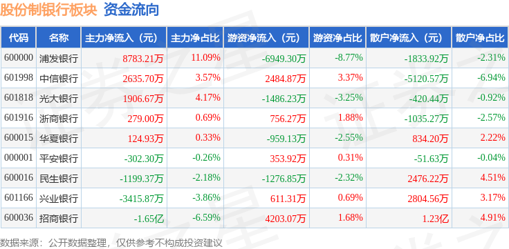 从资金流向上来看,当日股份制银行板块主力资金净流出7679.74万元,游资资金净流出2262.06万元,散户资金净流入9941.8万元。股份制银行板块个股资金流向见下表: