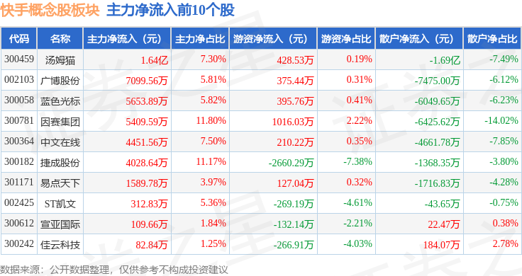 从资金流向上来看,当日快手概念股板块主力资金净流出2.77亿元,游资资金净流出9020.22万元,散户资金净流入3.67亿元。快手概念股板块个股资金流向见下表: