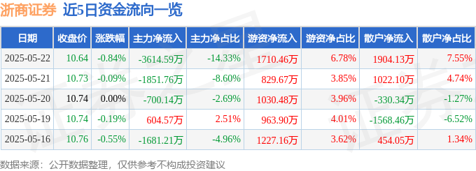 证券之星消息,截至2025年5月22日收盘,浙商证券(601878)报收于10.64元,下跌0.84%,换手率0.52%,成交量23.66万手,成交额2.52亿元。