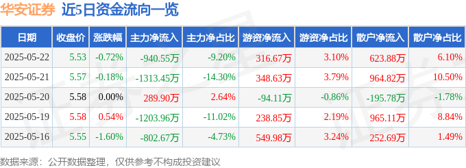 证券之星消息,截至2025年5月22日收盘,华安证券(600909)报收于5.53元,下跌0.72%,换手率0.39%,成交量18.46万手,成交额1.02亿元。