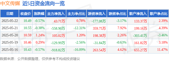 5月22日的资金流向数据方面,主力资金净流入43.71万元,占总成交额0.78%,游资资金净流出177.08万元,占总成交额3.17%,散户资金净流入133.37万元,占总成交额2.39%。