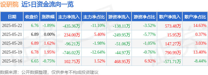 证券之星消息,截至2025年5月22日收盘,设研院(300732)报收于6.76元,下跌1.89%,换手率1.78%,成交量5.75万手,成交额3921.13万元。
