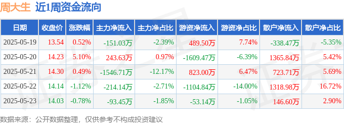 资金流向数据方面,本周周大生主力资金合计净流出1761.7万元,游资资金合计净流出1454.96万元,散户资金合计净流入3216.66万元。本周资金流向一览见下表: