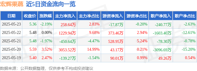 证券之星消息,截至2025年5月23日收盘,宏辉果蔬(603336)报收于5.36元,下跌2.19%,换手率2.97%,成交量16.92万手,成交额9138.03万元。