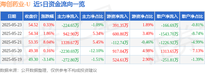 证券之星消息,截至2025年5月23日收盘,海创药业(688302)报收于54.52元,上涨0.33%,换手率4.59%,成交量3.74万手,成交额2.07亿元。