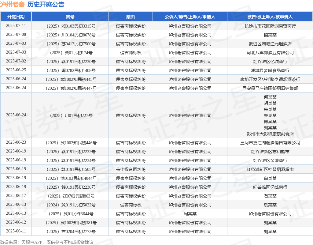案号:(2025)浙0381民初8357号根据统计,近一年内以泸州老窖股份有限公司为当事人的历史开庭公告有378则,其中案由为“侵害商标权纠纷”的公告以306则居首,其次为“侵害商标权”有22则,“商标权权属、侵权纠纷”有18则。历史开庭公告(前20条)如下: