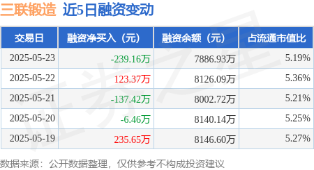 证券之星消息,5月23日,三联锻造(001282)融资买入848.78万元,融资偿还1087.94万元,融资净卖出239.16万元,融资余额7886.93万元,近20个交易日中有12个交易日出现融资净买入。