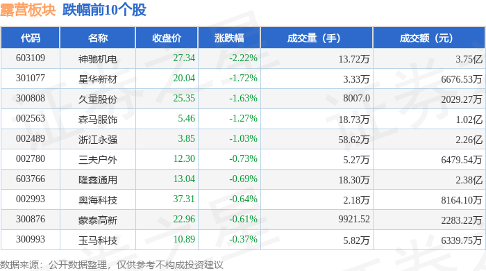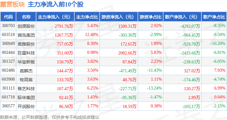 从资金流向上来看,当日露营板块主力资金净流出1.76亿元,游资资金净流出7207.64万元,散户资金净流入2.48亿元。露营板块个股资金流向见下表: