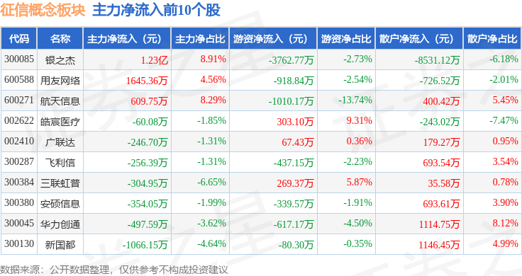 从资金流向上来看,当日征信概念板块主力资金净流入1743.66万元,游资资金净流出6203.43万元,散户资金净流入4459.77万元。征信概念板块个股资金流向见下表: