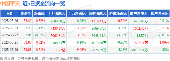 证券之星消息,截至2025年5月26日收盘,中国平安(601318)报收于53.4元,上涨0.32%,换手率0.36%,成交量38.81万手,成交额20.78亿元。