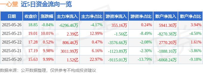 证券之星消息,截至2025年5月26日收盘,一心堂(002727)报收于18.85元,下跌0.84%,换手率20.2%,成交量80.26万手,成交额15.1亿元。