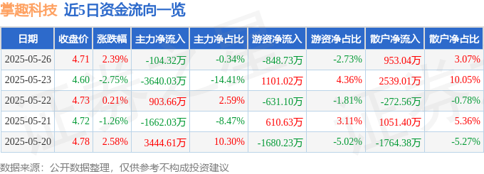 证券之星消息,截至2025年5月26日收盘,掌趣科技(300315)报收于4.71元,上涨2.39%,换手率2.56%,成交量66.0万手,成交额3.11亿元。