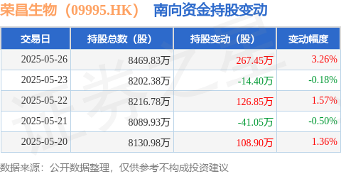 证券之星消息,5月26日南向资金增持267.45万股荣昌生物(09995.HK)。近5个交易日中,获南向资金增持的有3天,累计净增持447.75万股。近20个交易日中,获南向资金增持的有14天,累计净增持1089.88万股。截至目前,南向资金持有荣昌生物(09995.HK)8469.83万股,占公司已发行普通股的44.66%。