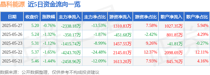 证券之星消息,截至2025年5月27日收盘,晶科能源(688223)报收于5.2元,下跌0.76%,换手率0.33%,成交量33.32万手,成交额1.73亿元。