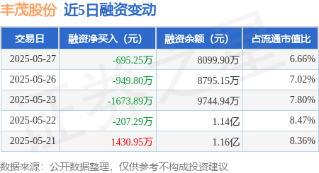 证券之星消息,5月27日,丰茂股份(301459)融资买入2110.12万元,融资偿还2805.36万元,融资净卖出695.25万元,融资余额8099.9万元。