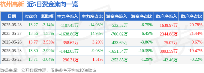 证券之星消息,截至2025年5月28日收盘,杭州高新(300478)报收于13.27元,下跌2.14%,换手率4.66%,成交量5.91万手,成交额7892.02万元。