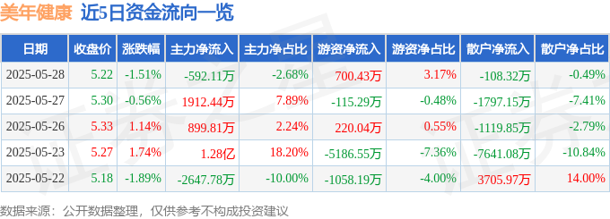 证券之星消息,截至2025年5月28日收盘,美年健康(002044)报收于5.22元,下跌1.51%,换手率1.09%,成交量42.25万手,成交额2.21亿元。