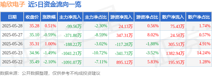 证券之星消息,截至2025年5月28日收盘,瑜欣电子(301107)报收于35.28元,上涨0.51%,换手率2.87%,成交量1.23万手,成交额4324.68万元。