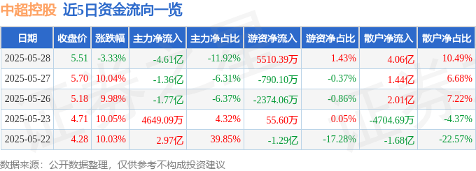 证券之星消息,截至2025年5月28日收盘,中超控股(002471)报收于5.51元,下跌3.33%,换手率51.82%,成交量676.26万手,成交额38.67亿元。