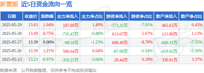 证券之星消息,截至2025年5月29日收盘,新雷能(300593)报收于13.63元,上涨1.04%,换手率1.18%,成交量5.32万手,成交额7245.48万元。
