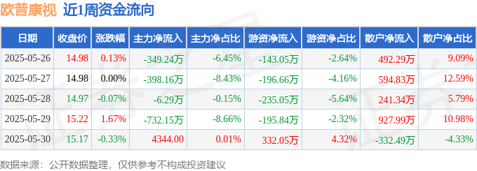 资金流向数据方面,本周欧普康视主力资金合计净流出1485.41万元,游资资金合计净流出438.54万元,散户资金合计净流入1923.96万元。本周资金流向一览见下表: