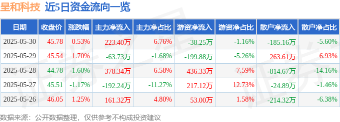 证券之星消息,截至2025年5月30日收盘,呈和科技(688625)报收于45.78元,上涨0.53%,换手率0.53%,成交量7227.0手,成交额3307.12万元。