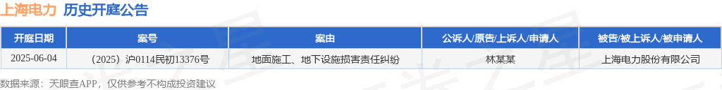 根据统计,近一年内以上海电力股份有限公司为当事人的历史开庭公告有1则,其中案由为“地面施工、地下设施损害责任纠纷”的公告以1则居首。历史开庭公告如下: