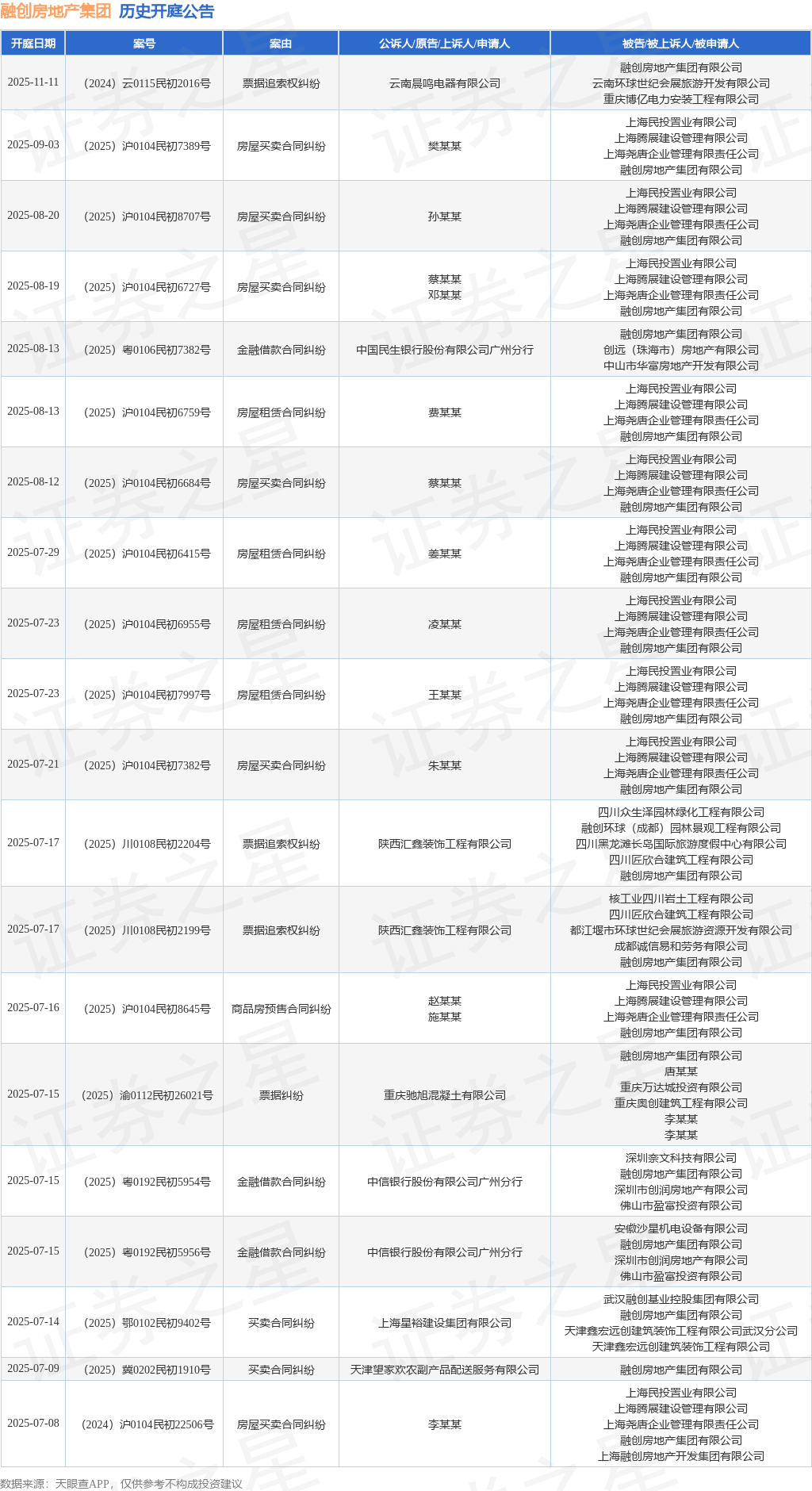 案号:(2024)沪74民初907号根据统计,近一年内以融创房地产集团有限公司为当事人的历史开庭公告有719则,其中案由为“票据追索权纠纷”的公告以218则居首,其次为“金融借款合同纠纷”有123则,“票据纠纷”有122则。历史开庭公告(前20条)如下: