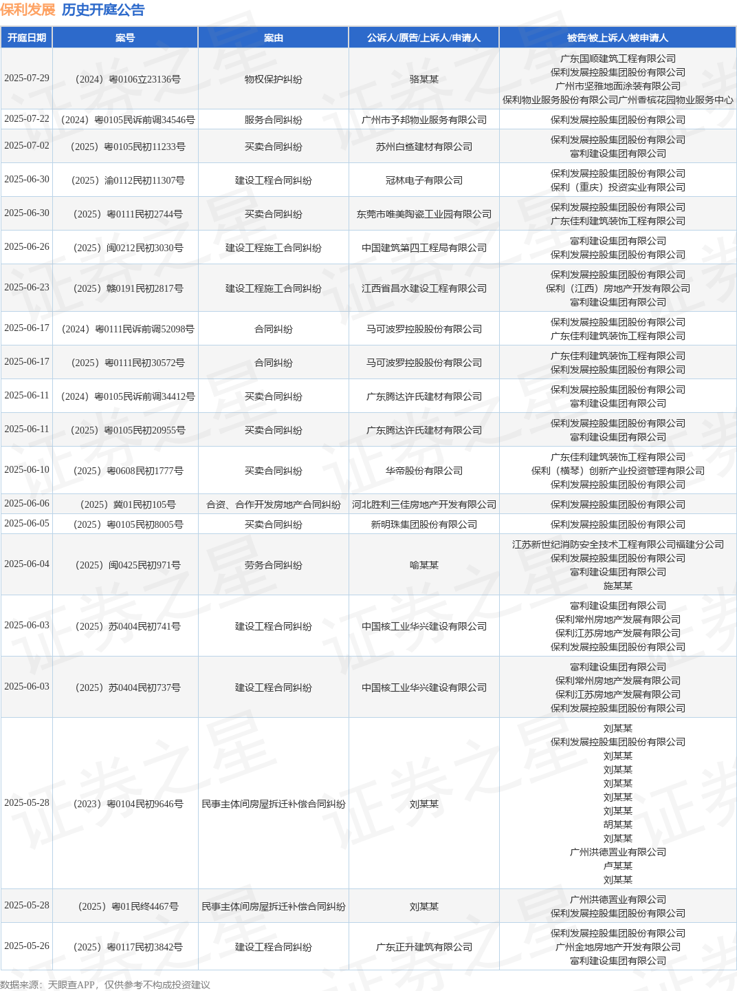 案号:(2025)粤0105民初8005号根据统计,近一年内以保利发展控股集团股份有限公司为当事人的历史开庭公告有93则,其中案由为“买卖合同纠纷”的公告以24则居首,其次为“建设工程合同纠纷”有13则,“建设工程施工合同纠纷”有11则。历史开庭公告(前20条)如下: