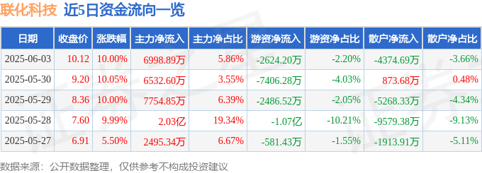 证券之星消息,联化科技6月3日涨停收盘,收盘价10.12元。该股于9点31分涨停,5次打开涨停,截止收盘封单资金为7045.83万元,占其流通市值0.77%。