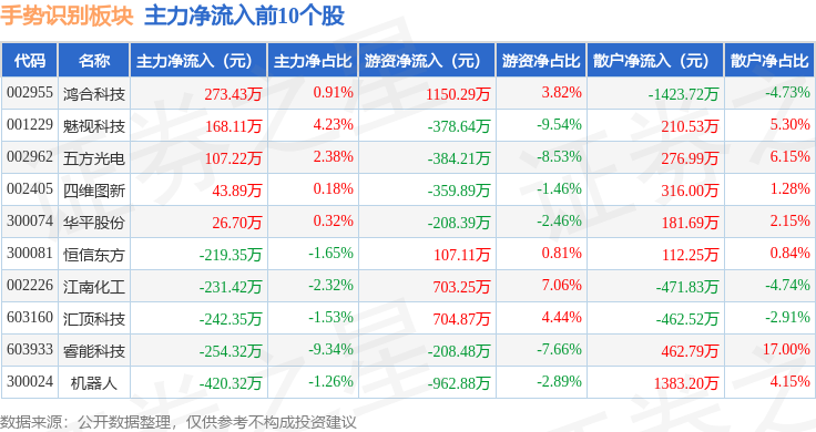 从资金流向上来看,当日手势识别板块主力资金净流出1.61亿元,游资资金净流入2743.79万元,散户资金净流入1.33亿元。手势识别板块个股资金流向见下表: