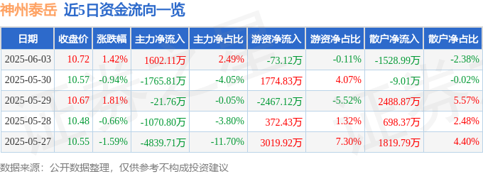 证券之星消息,截至2025年6月3日收盘,神州泰岳(300002)报收于10.72元,上涨1.42%,换手率3.28%,成交量59.62万手,成交额6.44亿元。